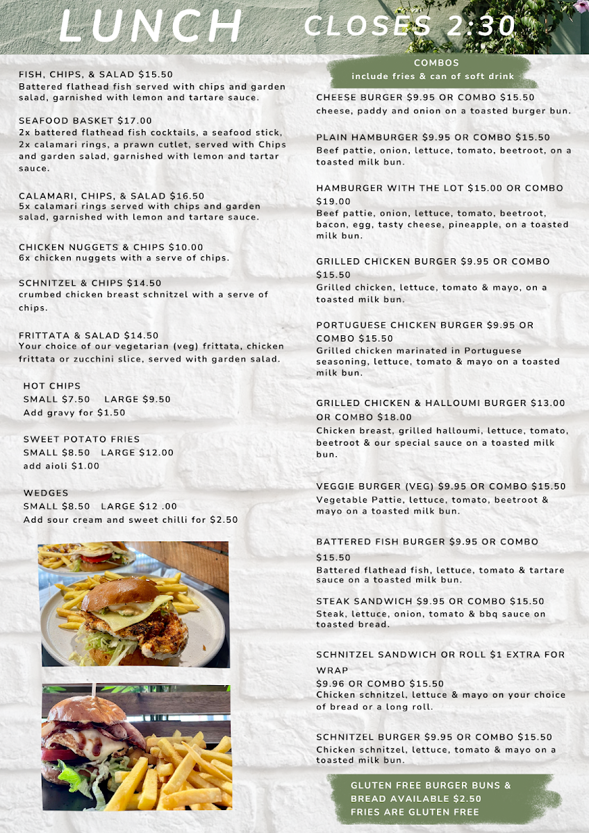 - Food Items: Seafood platter, chicken schnitzel burger, breakfast rolls, pastries, muffins, and other light meal options