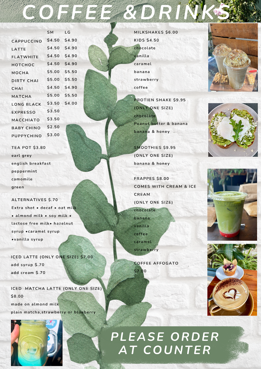 - Specialty Drinks: Iced strawberry & matcha latte (almond milk), coffee affogato, blueberry matcha latte